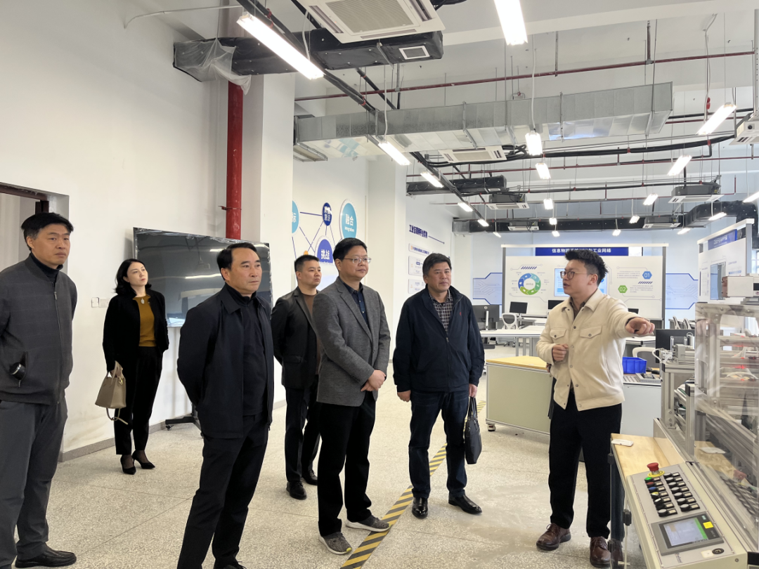 张开鹏(左三)、胡习文(右二)、张襄兵(右三)调研湖北工程职业学院电子信息实训室和产教融合公共实训中心