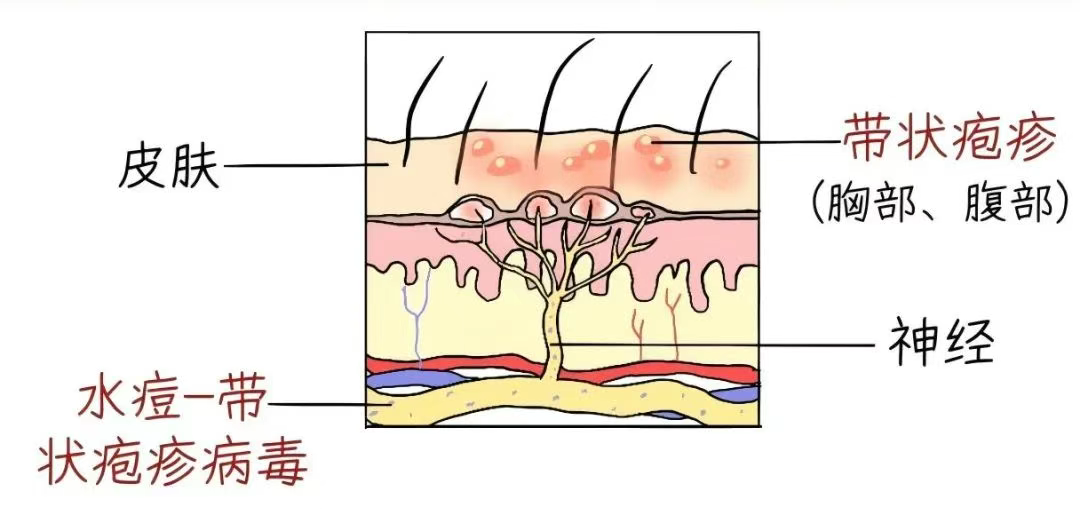 带状疱疹病毒会潜伏在神经节里,发病时不仅会让皮肤长疹子,还会损伤神经,即使疹子消退,受损的神经也可能持续异常放电,导致皮肤出现针扎样、火烧样疼痛。