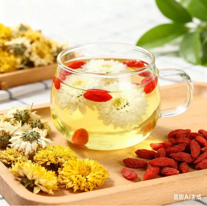 ③菊花枸杞茶:菊花5~8朵、枸杞10粒,冲泡饮用。清肝明目,有助于平稳血压,缓解秋季眼干、头晕。