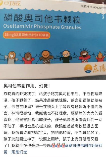 在社交媒体上搜索“奥司他韦副作用”, 可以看到不少家长描述孩子服药后出现了精神行为异常。