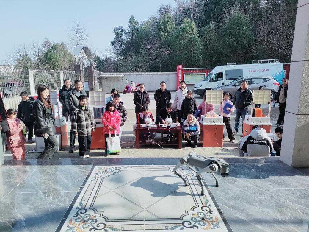 活动现场秩序井然,村民们参与科普活动的热情十分高涨。在科普互动展品周围,大人小孩欢聚一堂,在科普志愿者的耐心指导下有序操作。在下棋机器人旁,村里的青少年纷纷挑战对弈,在趣味博弈中锻炼逻辑思维能力。在机器狗展演时,灵动的机器狗听从指令灵活运转,完成跳跃、翻滚等一系列动作,村民们纷纷驻足观看、拿出手机记录,在近距离互动中感受人工智能的科技力量。活动中,市科协还向朝六村留守儿童、困难家庭子女捐赠了科学实验套装,内含趣味实验器材和操作手册,让孩子们在家就能开展科普小实验,持续激发科学探索兴趣。此次活动不仅丰富了乡村群众的新春文化生活,更弥补了乡村科普资源不足的短板。