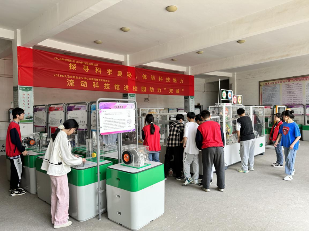 活动当天,2023年中国科协流动科技馆巡展也走进该校。巡展分为设置运动旋律、数学魅力、声光体验、电磁探秘、汽车制造、科学表演、科普影视等七大主题展区,包括转体生花,锥体上滚,汽车离合器、魔镜、镜面立方体、光线游戏等50多个设备。科普志愿者向学生讲解科学原理,指导学生操作体验,让学生们近距离感受科学的神奇与魅力。