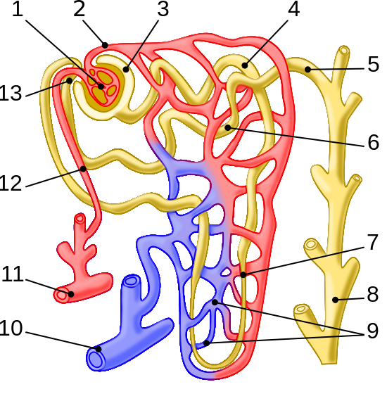 肾单位示意图:1.肾小球, 2. 出球小动脉, 3. 鲍氏囊, 4. 近曲小管, 5. 皮质集合管, 6. 远曲小管, 7. 亨利氏环, 8. 贝里尼管, 9. 肾小管周围毛细血管, 10. 弓形静脉, 11. 弓形动脉, 12. 入球小动脉, 13. 近血管球体 来源丨维基百科