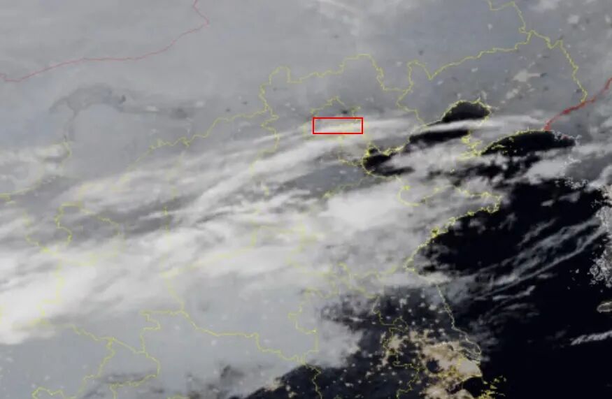 16 日夜间风云四号 B 星云图,可以看到位于高空冷锋区域、覆盖华北大部的卷云和卷层云,北京恰好位于其北侧边缘,云体边界较为“犀利”,出现了“阴阳天”的效果(红色框圈出来的部分)。图片来源:国家卫星气象中心