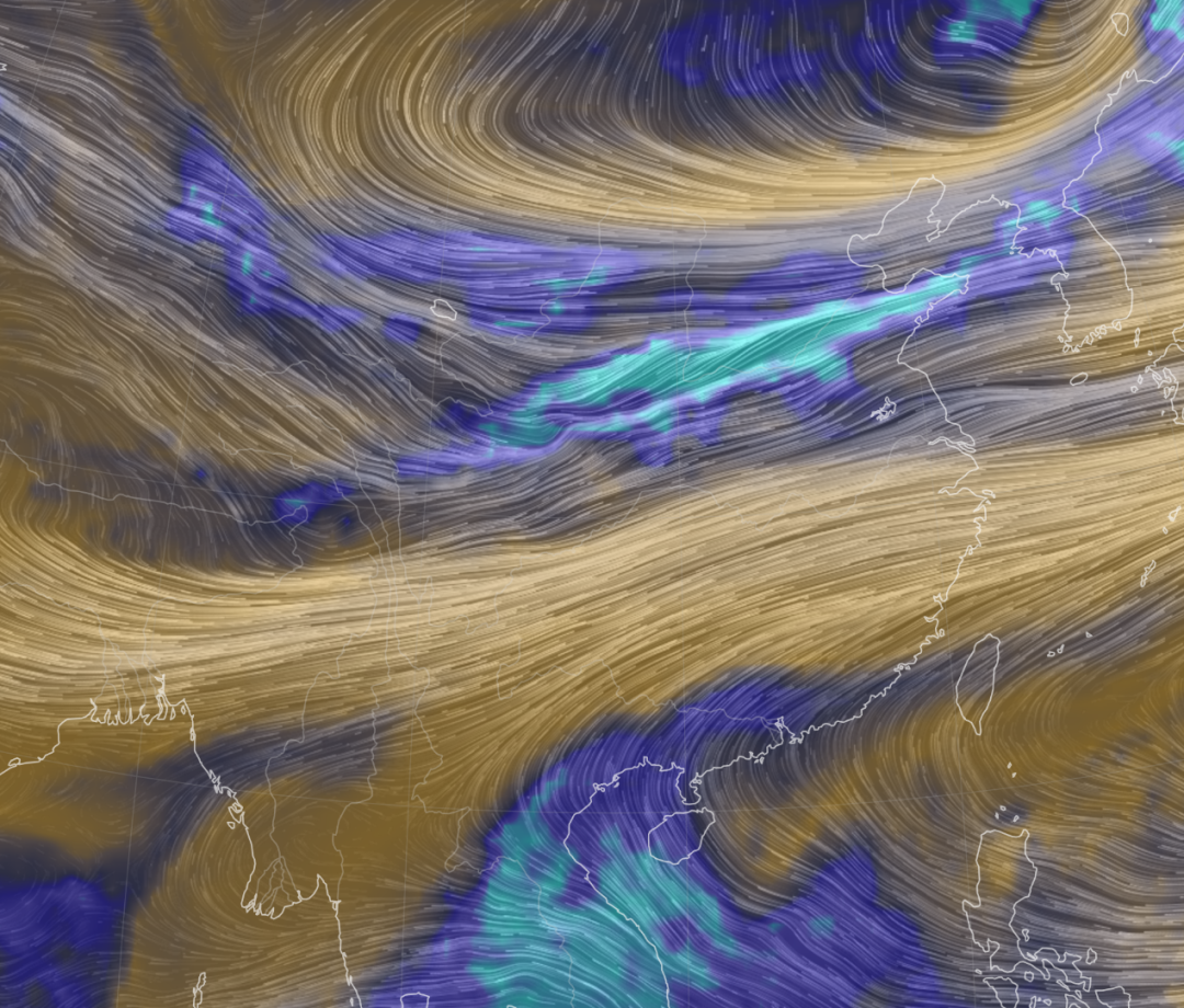 16 日夜间约 5500 米高空的相对湿度和风场,可以看到华北的大范围较高湿度区,北京位于其边缘(从棕黄色到蓝绿色湿度不断增大)。图片来源:earth.nullschool.net