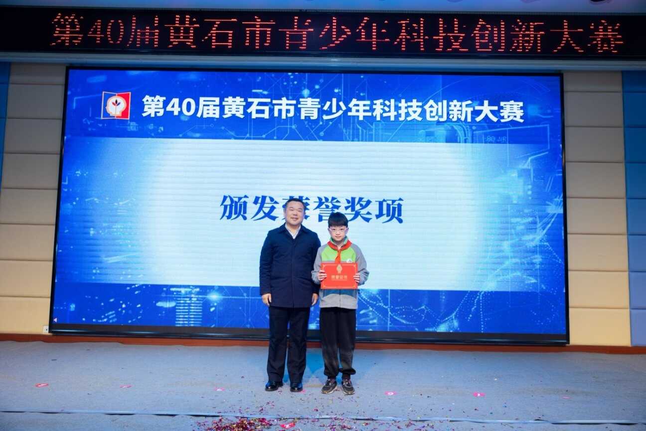 黄石市政协副主席、科协主席李义词为第38届湖北省青少年科技创新大赛青少年科技创新成果一等奖获奖者颁奖